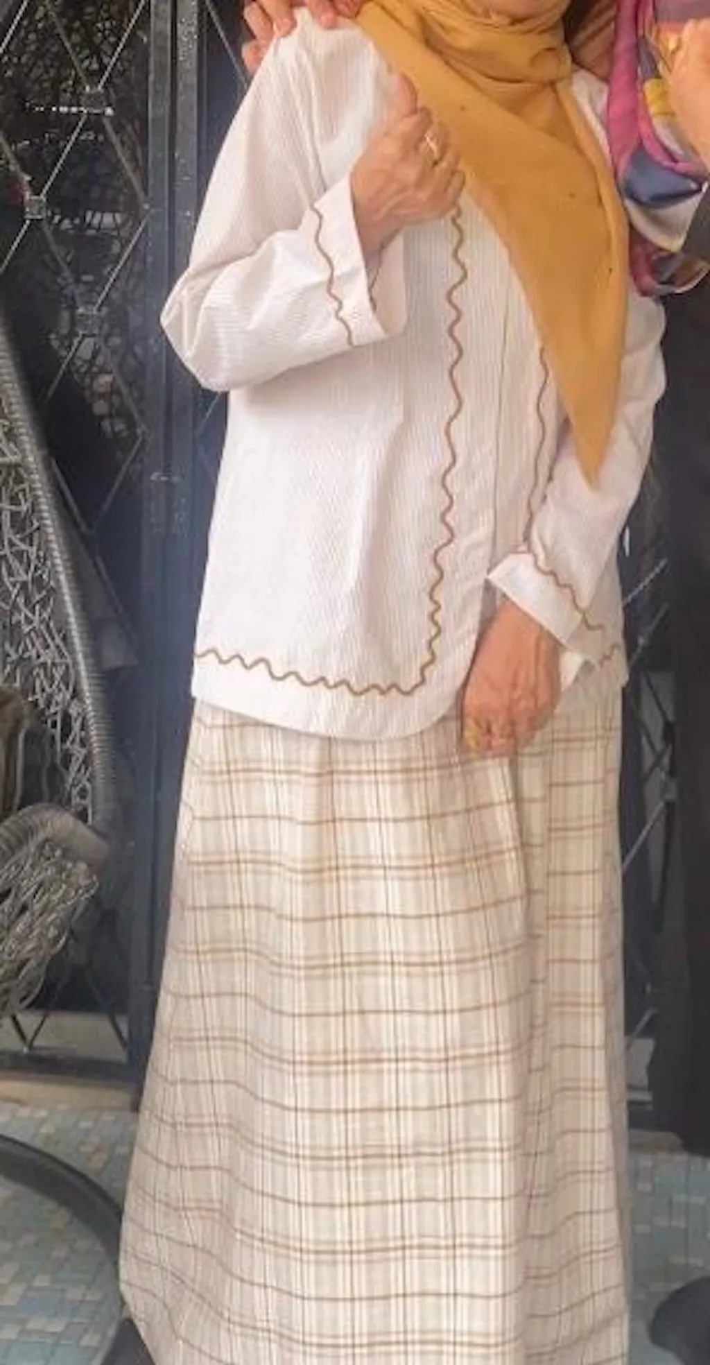 Scallop stitching details along front opening, sleeve hems and bottom hem